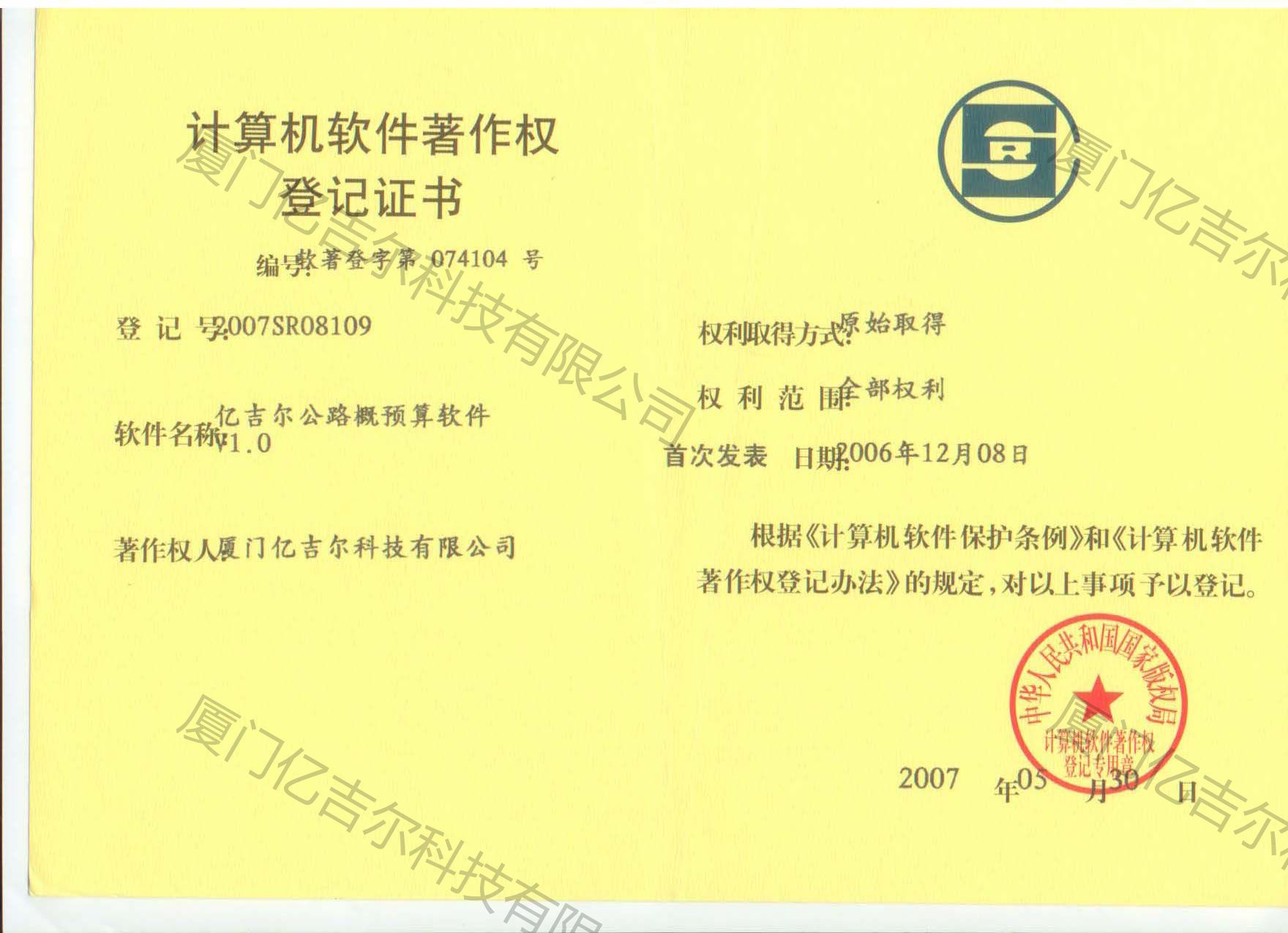 億吉爾公路概預(yù)算軟件著作權(quán)登記證書 發(fā)布日期:2007年05月30日 瀏覽次數(shù):3302 關(guān)鍵字: 公司 1/1億吉爾公路概預(yù)算軟件著作權(quán)登記證書